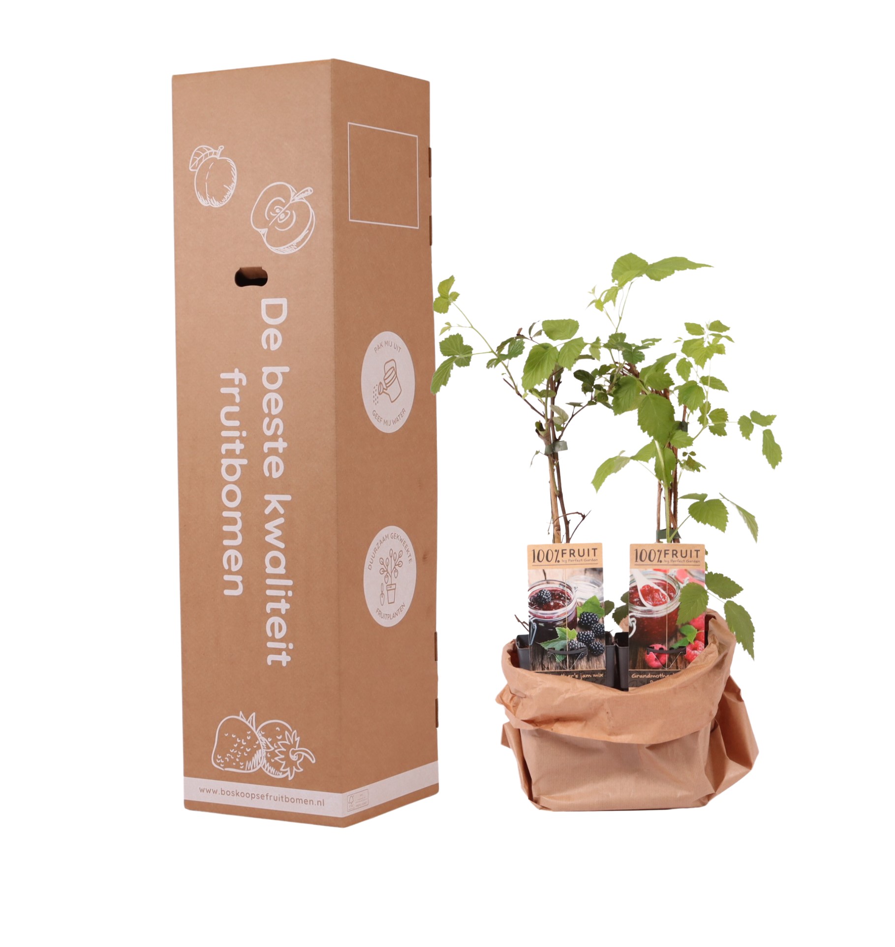 Geef een blijvend cadeau met een persoonlijke touch! Deze set van frambozen- en bramenplanten is perfect voor een mini-moestuin, thuis op het balkon of in de tuin. Een duurzaam geschenk waarmee je relaties écht verrast. Keuze uit de wijnmix, jammix of blauwe bessenmix