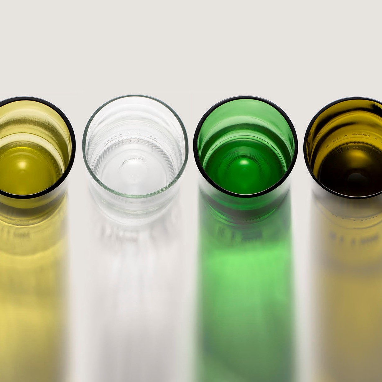De tumblers worden geleverd in de kleuren olive, transparant, groen, amber of een assorti van kleuren. De sets zijn ook verkrijgbaar in sets per 2 stuks.