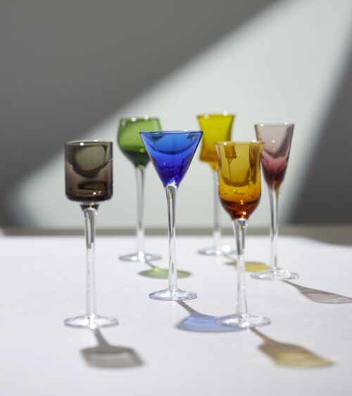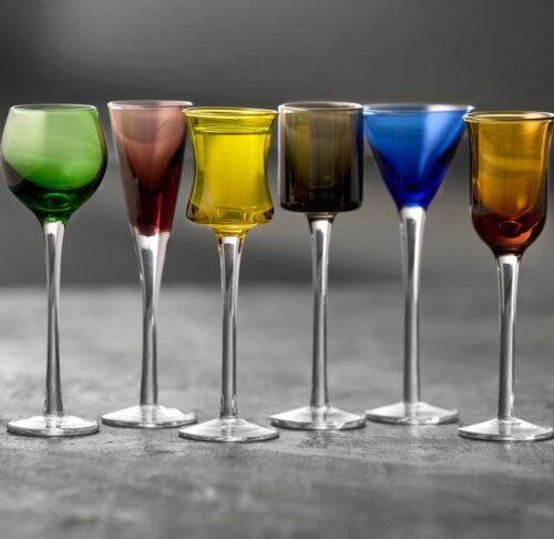 Een chique set met zes verschillende gekleurde, mondgeblazen schnappsglazen, zorgen voor een gezellige sfeer aan tafel en maken het gemakkelijk om uw eigen glas te vinden. De verschillende gevormde & gekleurde glazen hebben een inhoud van 2,5 cl tot 5 cl. Mooi als toevoeging van een pakket maar ook als jubileumcadeau!