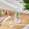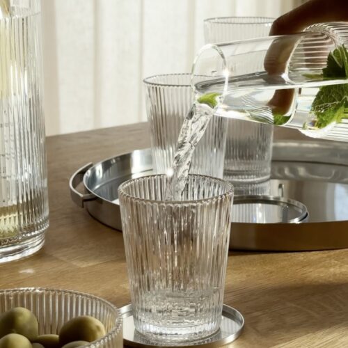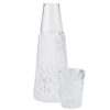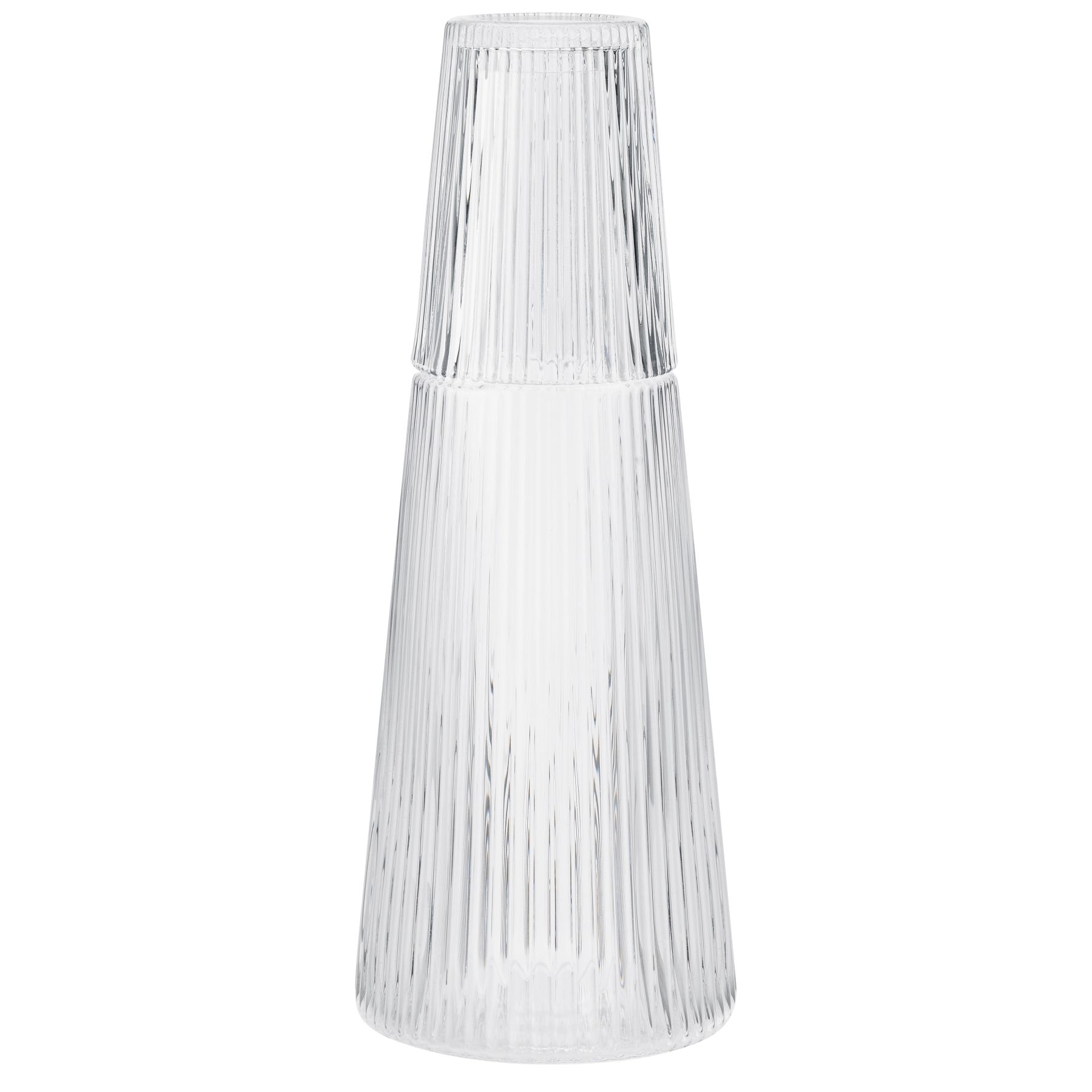Deze prachtige karaf met bijbehorend glas heeft dezelfde verfijnde uitstraling, strakke vormen en een gegroefd oppervlak. De karaf heeft een inhoud van 1 liter en wordt geleverd met een kleiner glas van 15 cl dat tevens als deksel dient, een perfecte cadeauset voor op kantoor of voor elke thuiswerkplek.